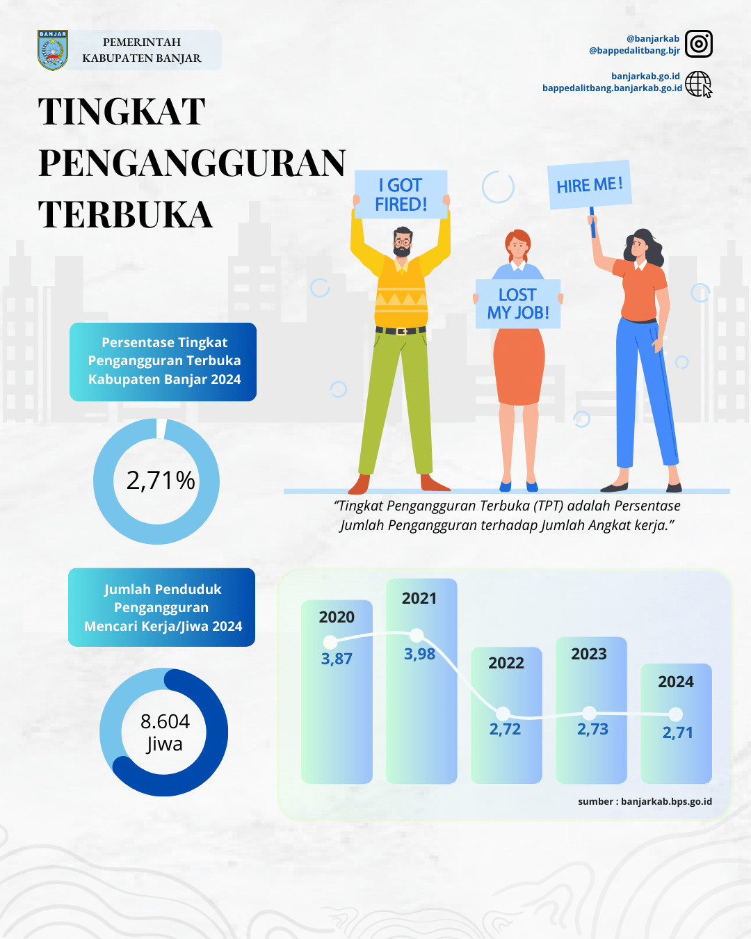Berdasarkan data BPS, Kabupaten Banjar mencatatkan penurunan TPT yang konsisten sejak tahun 2021, di mana angka tertinggi tercatat sebesar 3,98%. Dalam tiga tahun terakhir, TPT berhasil ditekan hingga berada di angka 2,71% pada 2024.