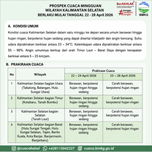 “Secara umum cuaca Kalimantan Selatan dalam sepekan ke depan berawan hingga hujan ringan, dengan potensi hujan sedang yang dapat disertai kilat dan angin kencang,” ujarnya di Banjarbaru, Rabu (22/4/2026).