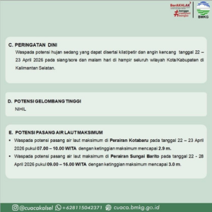 Selain itu, masyarakat pesisir diminta meningkatkan kewaspadaan terhadap potensi pasang air laut maksimum di Perairan Kotabaru pada 22–23 April pukul 07.00–10.00 WITA dengan ketinggian mencapai 2,9 meter, serta di Perairan Sungai Barito pada 22–28 April pukul 09.00–16.00 WITA dengan ketinggian hingga 3,0 meter.
