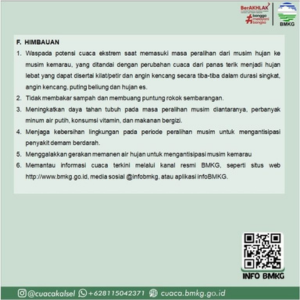 Masyarakat juga diimbau untuk terus memantau informasi cuaca terkini melalui kanal resmi BMKG, baik aplikasi Info BMKG, situs resmi, maupun media sosial, guna mengantisipasi dampak yang mungkin terjadi.