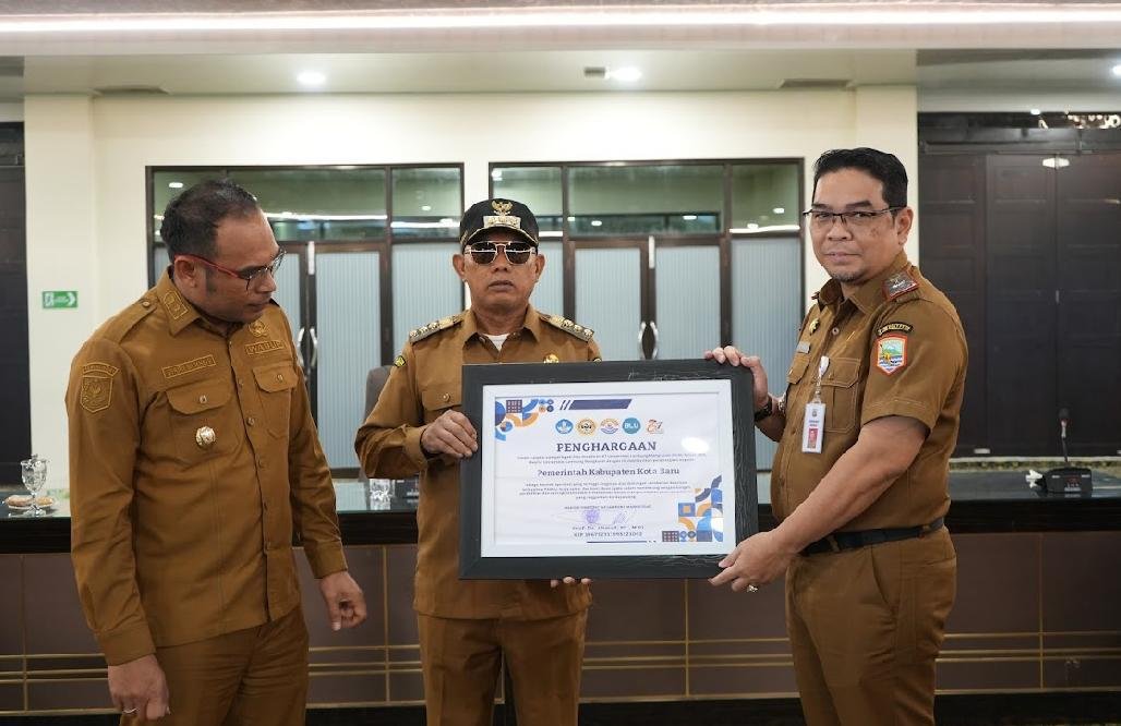 Piagam penghargaan lantas diserahkan kembali oleh Sekda kepada Bupati Muhammad Rusli dan Wakil Bupati Syairi Mukhlis di Aula Bamega Setda Kotabaru, Senin (06/10/2025).