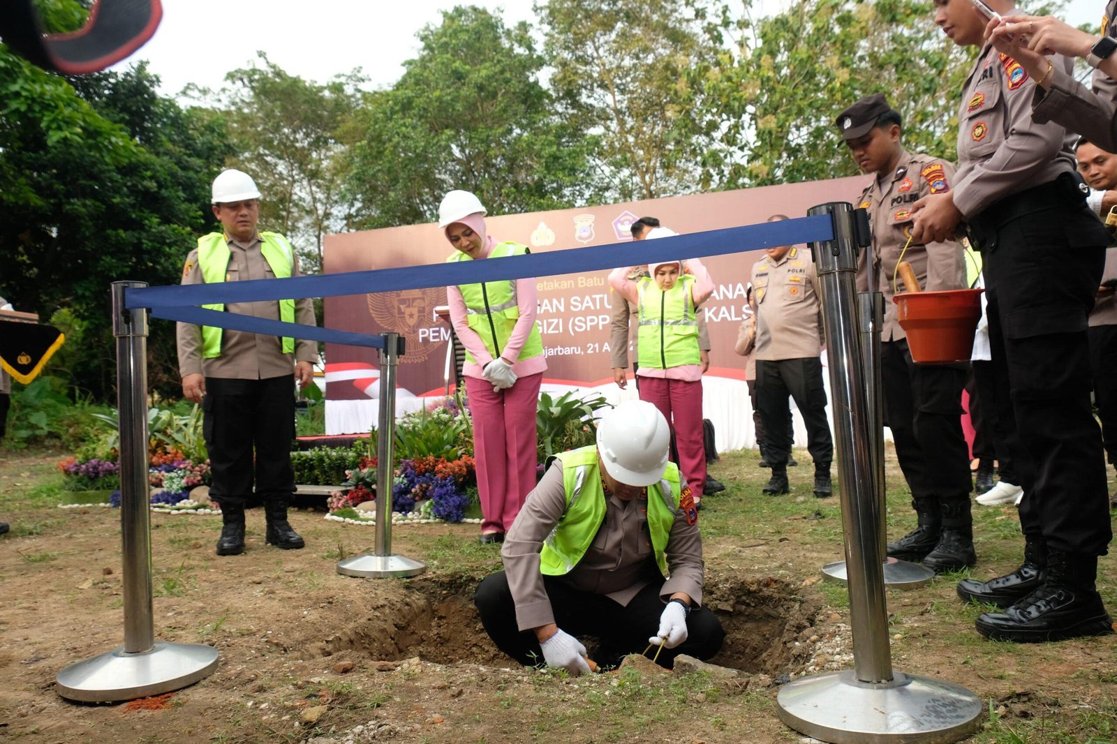 Acara peletakan batu pertama tersebut dihadiri oleh Kapolda Kalsel, Ketua Bhayangkari Daerah Kalsel, Wakapolda Kalsel, Pejabat Utama Polda Kalsel, Pengurus Bhayangkari Daerah Kalsel, Kapolres Banjarbaru, H. Kaspul Anwar (vendor pembangunan SPPG), dan Ustadz Rizal Fatoni.