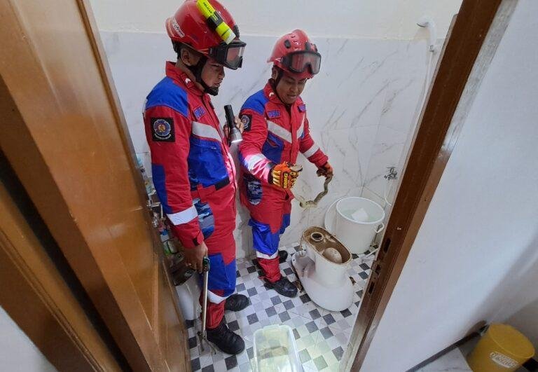 Kemungkinan besar ular tersebut masuk melalui saluran kloset. “Ukuran ularnya sekitar 150 centimeter jenis sanca kembang,” sambung M Kasyaf.