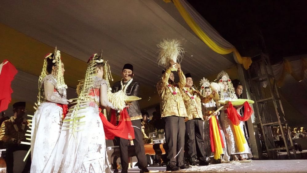 Tari Mayang Sari sebagai tanda Opening Ceremony Harjad ke-74 Kotabaru, ketiga penari menuju panggung utama untuk menyerahkan sebatang pelepah daun mayang agar ditepukkan oleh Paman Birin dan Bupati Kotabaru, H Sayed Jafar Alaydrus.