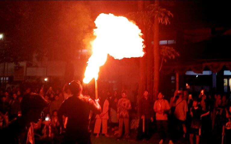Setelah beberapa saat, terdengar semburan api dari atraksi salah satu peserta. Sontak direspons meriah para peserta dan warga yang menyaksikan. Atraksi sembur api ini pun turut diikuti oleh peserta lainnya.