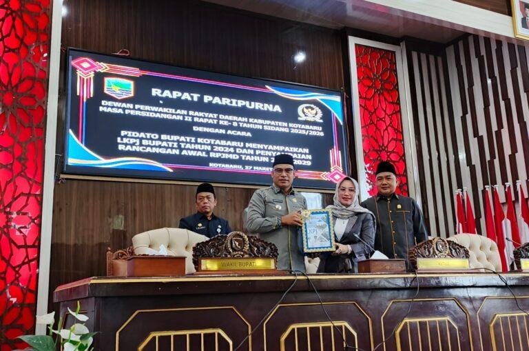 Riceknews.Id – DPRD Kabupaten Kotabaru menggelar Rapat Paripurna masa persidangan II Rapat ke-8 Tahun Sidang 2025 – 2026;pada Kamis (07/03/2025), yang berlangsung di Gedung DPRD. Dalam rapat tersebut, Wakil Bupati Syairi Mukhlis mewakili Bupati Kotabaru menyampaikan Laporan Keterangan Pertanggungjawaban (LKPJ) Bupati Tahun 2024 dan Rancangan Awal Rencana Pembangunan Jangka Menengah Daerah (RPJMD) Tahun 2025-2029.