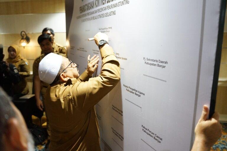 Penandatanganan ini melibatkan Wakil Bupati, Forkopimda, perwakilan BKKBN Kalsel, akademisi Poltekkes Banjarmasin, Baznas Kabupaten Banjar, serta para camat.