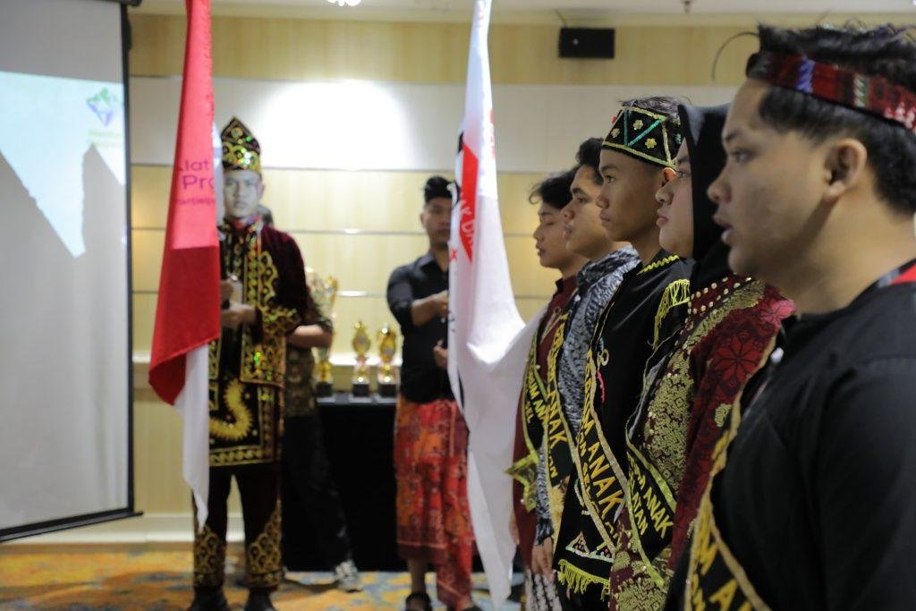 Dua anak muda berpakaian adat Banjar memegang bendera, Staf Ahli Gubernur Adi Santoso membacakan sumpah kepada 80 pengurus FAD Provinsi Kalsel yang tergabung dari 13 Kabupaten/Kota. Selanjutnya ditampilkan Parade Nusantara.