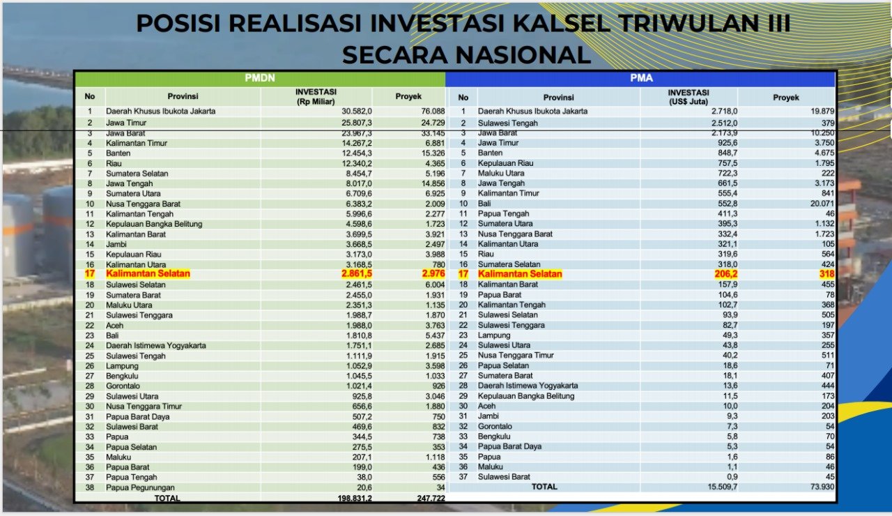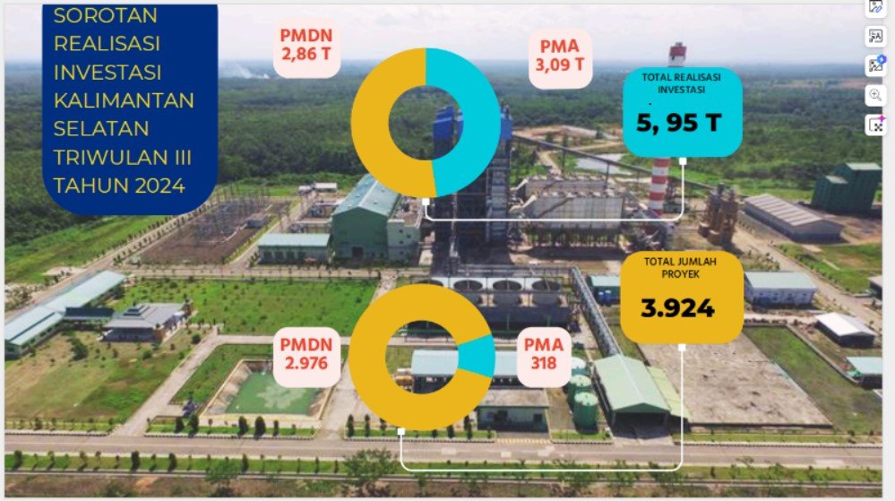 Khusus realisasi penanaman modal di Provinsi Kalsel triwulan III (Juli – September) 2024 mencapai angka Rp5.954.08 triliun mencakup 3.924 proyek, yang terdiri dari penanaman modal dalam negeri (PMDN) sebesar Rp 2.861,5 triliun meliputi 2.976 proyek, dan penanaman modal asing (PMA) sebesar Rp.3.092.53 triliun dengan jumlah 318 proyek.