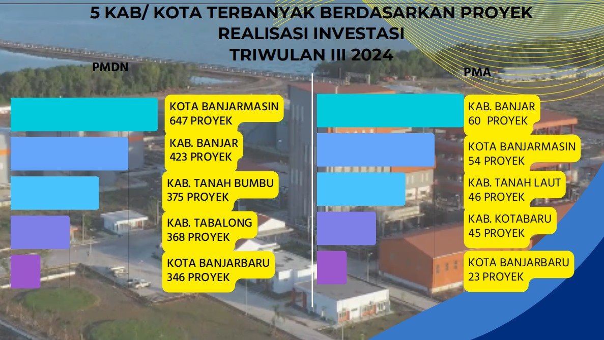 Ia melanjutkan, realisasi PMDN tertinggi terjadi pada triwulan III 2024 ada di Kota Banjarmasin dengan nominal Rp 715 082, 20 miliar dengan 647 proyek, disusul Kabupaten Tanah Bumbu dengan realisasi Rp633.275,90 miliar dengan 375 proyek, dan Kabupaten Banjar sebesar Rp 508.165,30 miliar untuk 423 proyek.