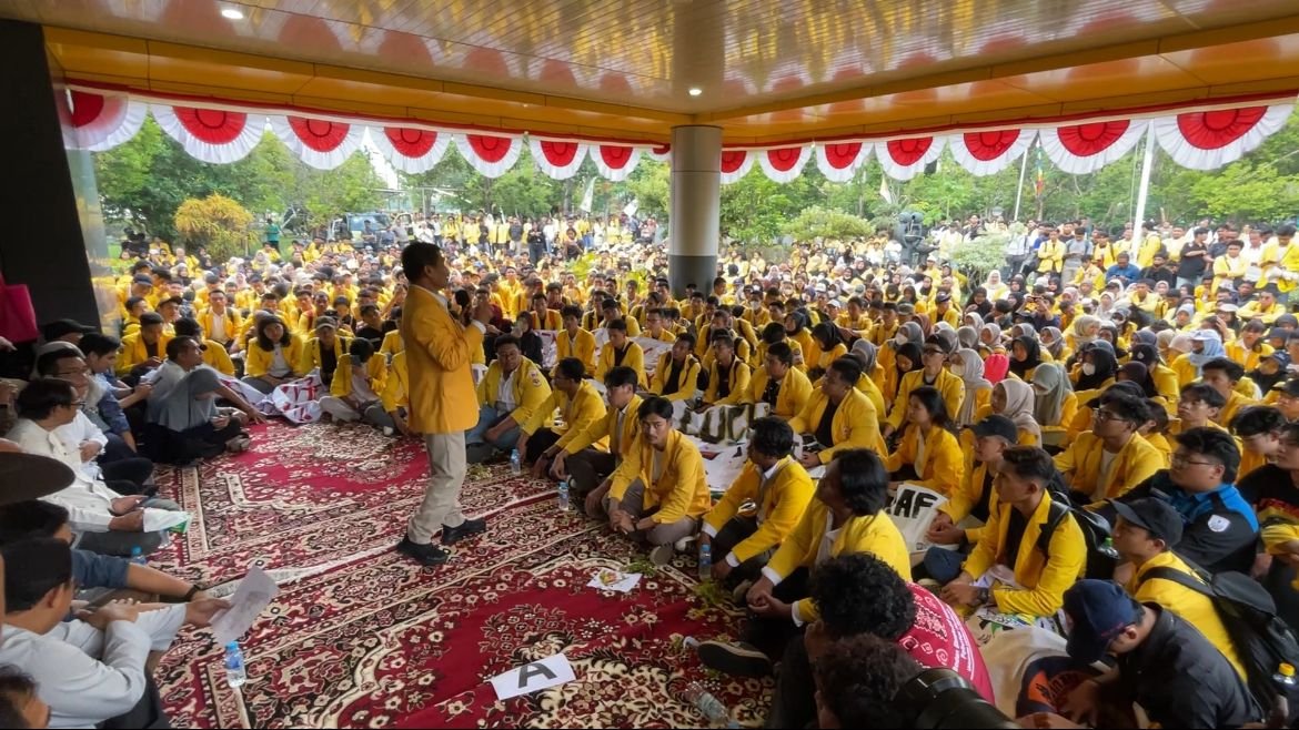 Para mahasiswa tidak hanya berorasi, tetapi juga menampilkan teatrikal sebagai bentuk protes mereka.