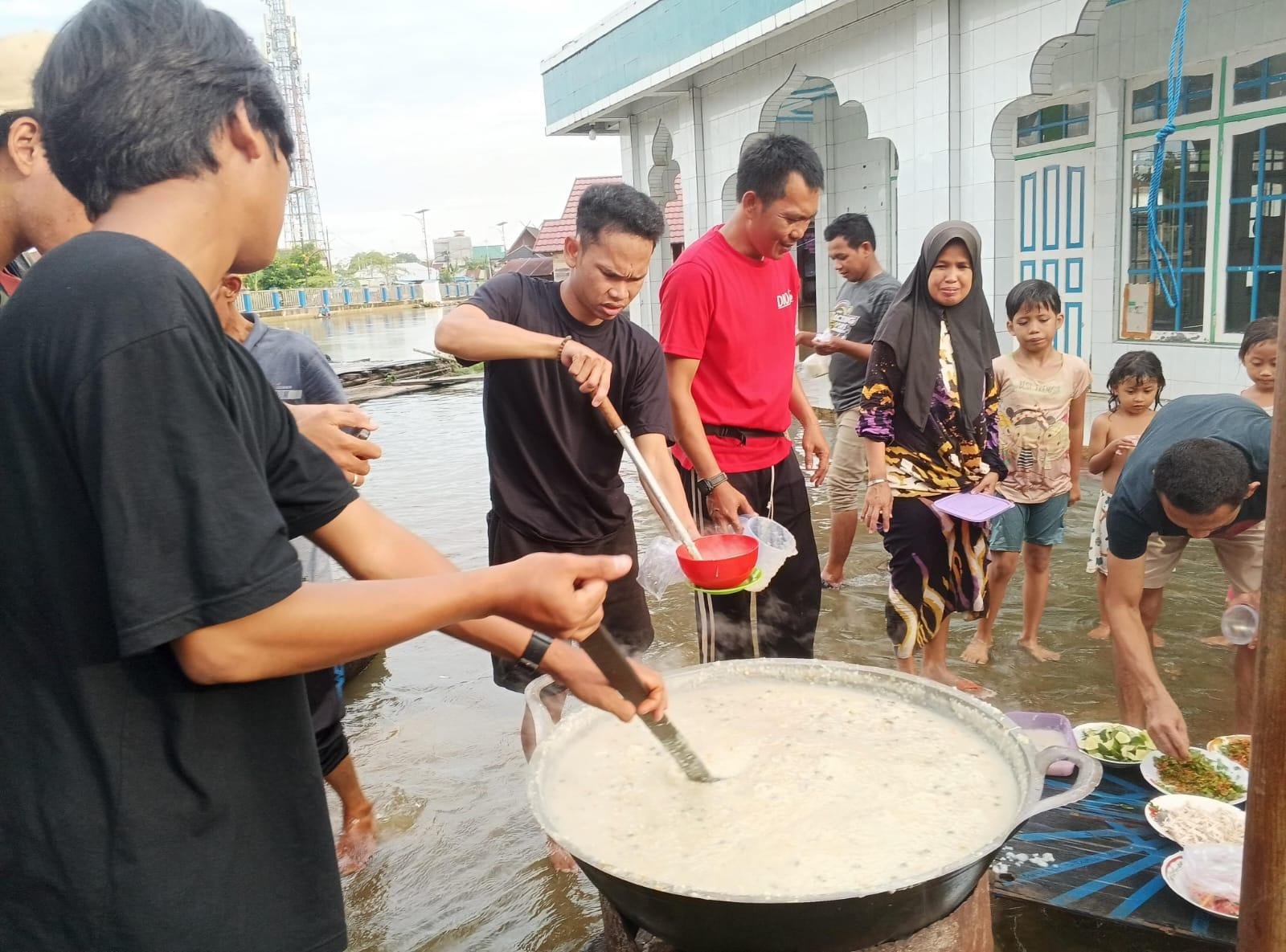 Sambil berendam di air yang masih menggenangi rumah mereka, warga terlihat bergotong royong mengaduk bubur panas di dalam kawah besar. Kayu bakar dan arang menjadi bahan bakar untuk memasak bubur tersebut.