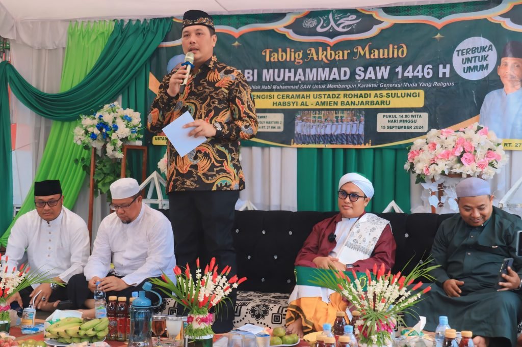 Wali Kota Banjarbaru, H. M. Aditya Mufti Ariffin hadiri Tablig Akbar Maulid Nabi Muhammad SAW 1446 Hijriyah, di Lapangan Voly Kasturi 2, Jalan Bataan RT 27 RW 06, Kelurahan Syamsudin Noor, Kecamatan Landasan Ulin Banjarbaru, Minggu (15/09/2024).